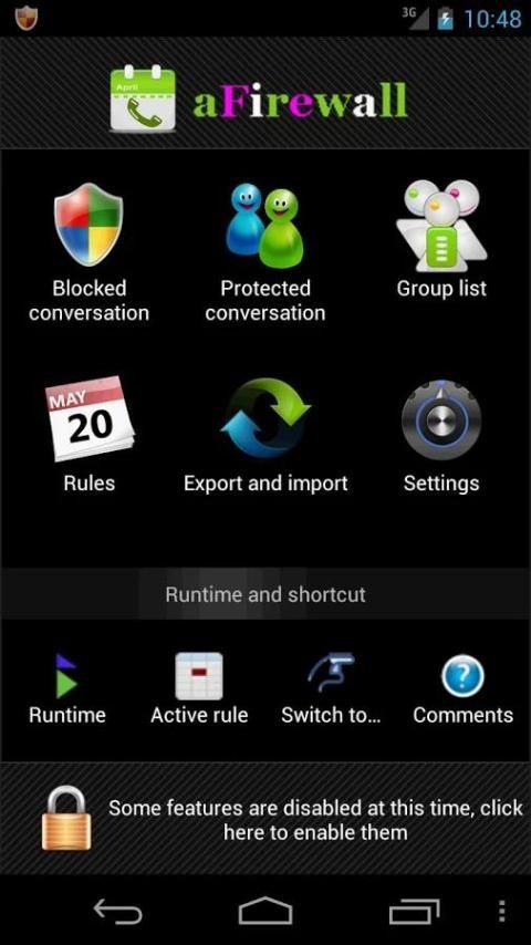aFirewall एंड्रॉयड फ़ायरवॉल मतलब है. यह आपको अलग समय पर अलग कॉल या संदेश को ब्लॉक करने के लिए बहु नियम कॉन्फ़िगर करने के लिए अनुमति देता है. आवर्त नियम और एक शॉट समय शासन समर्थित हैं.