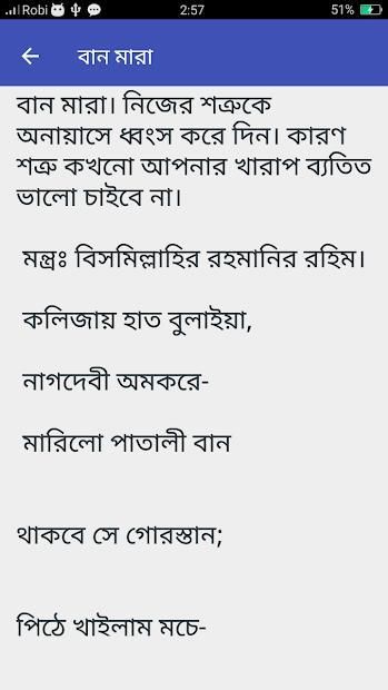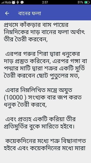 নিজের শত্রুকে অনায়াসে ধ্বংস করে দিন। কারণ শত্রু কখনো আপনার খারাপ ব্যতিত ভালো চাইবে না। মন্ত্রঃ বিসমিল্লাহির রহমানির রহিম। কলিজায় হাত বুলাইয়া, নাগদেবী অমকরে- মারিলো পাতালী বান" থাকবে সে গোরস্তান; পিঠে খাইলাম মুচে- বুকে খাইলাম চুষে" নাগদেবীর বানে তার-এধরনের কাজই হচ্ছে সাধারন ভাষায় কালো জাদু বা ব্ল্যাক ম্যাজিক। একে ডার্ক আর্ট, ডার্ক ম্যাজিক, ভূডূ, ডাকিনী বিদ্যা,মারণ, উচাটন, তাবিজ করা, বান মারা, কুফরি কালাম ইত্যাদিও বলা হয়ে থাকে। ভূত বা প্রেতাত্মার সঙ্গে যোগাযোগ স্থাপন করে ভবিষ্যদ্বাণী বা কোনো কাজ করার বিদ্যাকে নেক্রোম্যান্সি বা কালো জাদু বলে।