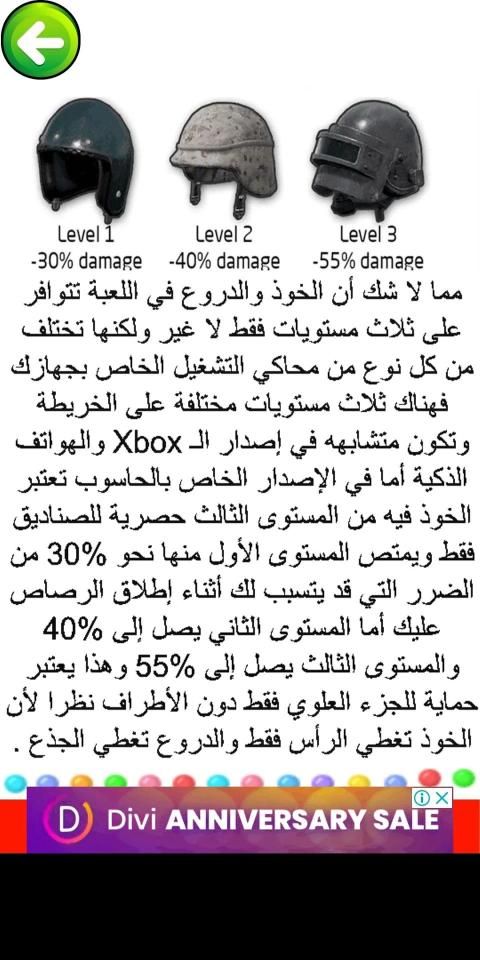 عن جميع الأسلحة الموجودة في لعبة ببجي وصفاتها ومميزاتها حيث أن تلك الأسلحة لها العديد من الإستخدامات السلبية والإيجابية لذلك ستجد بالتطبيق كل سلاح يستخدم داخل اللعبة وكل التفاصيل عنه وايضا الخوذ والدروع