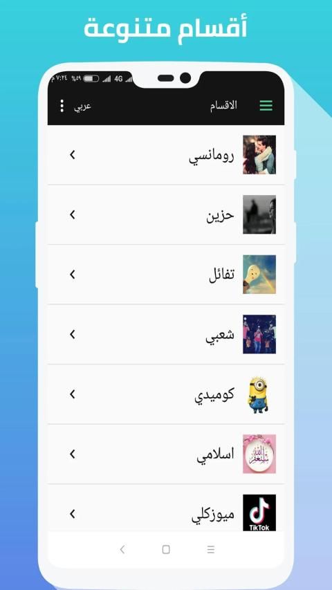 التطبيق مقسم الى مجموعة من الاقسام يوجد قسم حالات رومانسية, حالات حزن, حالات شعبي, حالات رياضية, حالات حكم ومقولة, حالات فراق, حالات ندم, حالات اغاني, حالات رقص, حالات مهرجانات, حالات ميزوكلى, حالات تيك توك, حالات تفائل, حالات كوميدية.