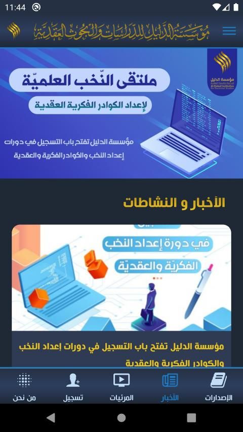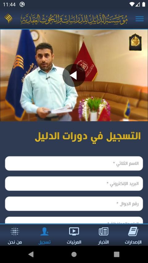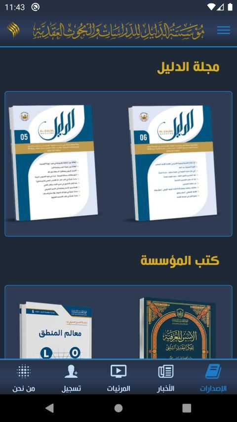 تطبيق شامل مجاني يحوي جميع الإصدارات والنشاطات التي تقوم بها مؤسسة الدليل للدراسات والبحوث العقدية التابعة للعتبة الحسينية المقدسة، كما يمكن من خلال هذا التطبيق التسجيل في الدورات الفكرية والعقدية التي تقوم بها المؤسسة لمختلف الفئات الأكاديمية من أساتذة وطلاب جامعيين ومدرسين ومعلمين ومشرفين تربويين وغيرهم، وسنعمل على تطويره في القريب العاجل ليشمل قابليات أخرى.