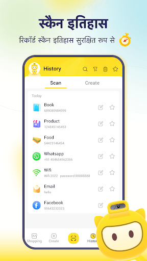 सभी स्कैन किए गए और बनाए गए क्यूआर कोड का रिकॉर्ड स्थायी रूप से सहेजा जाता है, और इतिहास सूची विज़िट किए गए स्थानों और क्यूआर कोड लिंक के इतिहास को प्रबंधित करना और साफ़ करना आसान बनाती है।