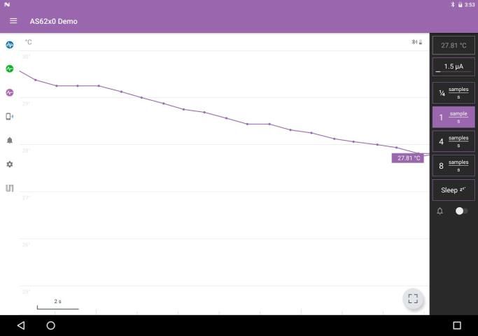 एम्स AS62x0 तापमान सेंसर App आपको AS62x0 डेमो बटन के साथ बातचीत करने की अनुमति देता है। यह सभी उपलब्ध मापदंडों को संशोधित करने और पूर्ण सुविधा सेंसर के सेट का पता लगाने के लिए सक्षम बनाता है।
