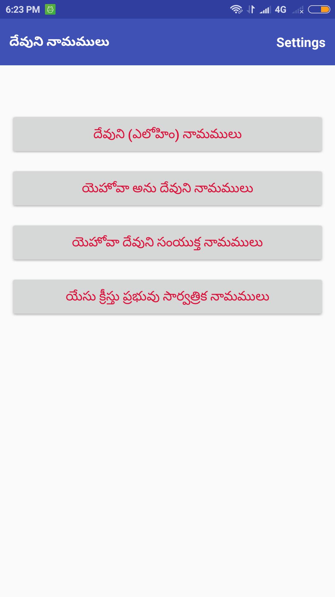 4. ప్రతి పరిస్థితికి, సందర్భమునకు మరియు సమస్యకు మన దేవుడు ఆశ్రయించదగిన దేవుడని విశ్వసించి ధైర్యపడుటకుగాను దేవునికి గల ఎన్నెన్నో నామములలో సుమారుగా 141 నామములు సెట్టింగు ఓపెన్ చేసి దేవుని నామములు క్లిక్ చేస్తే సందర్భానికి సరిపోయే నామము గురించి చదువుకోవచ్చు.