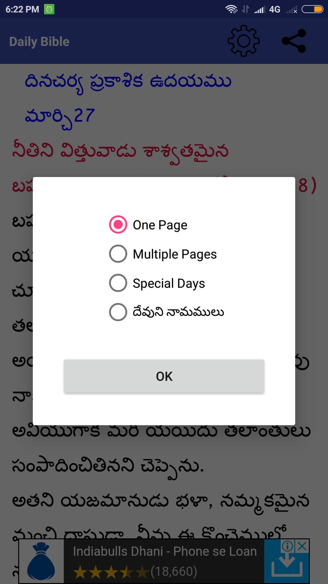 2. వేరే రోజుల వాక్యభాగము ధ్యానించడానికి సెట్టింగు ఓపెన్ చేసి Multipul Pages క్లిక్ చేస్తే క్యాలండరు ప్రకారం కోరుకొన్న తేదీ యొక్క వాక్యము చదువుకొనే వెసులుబాటు.