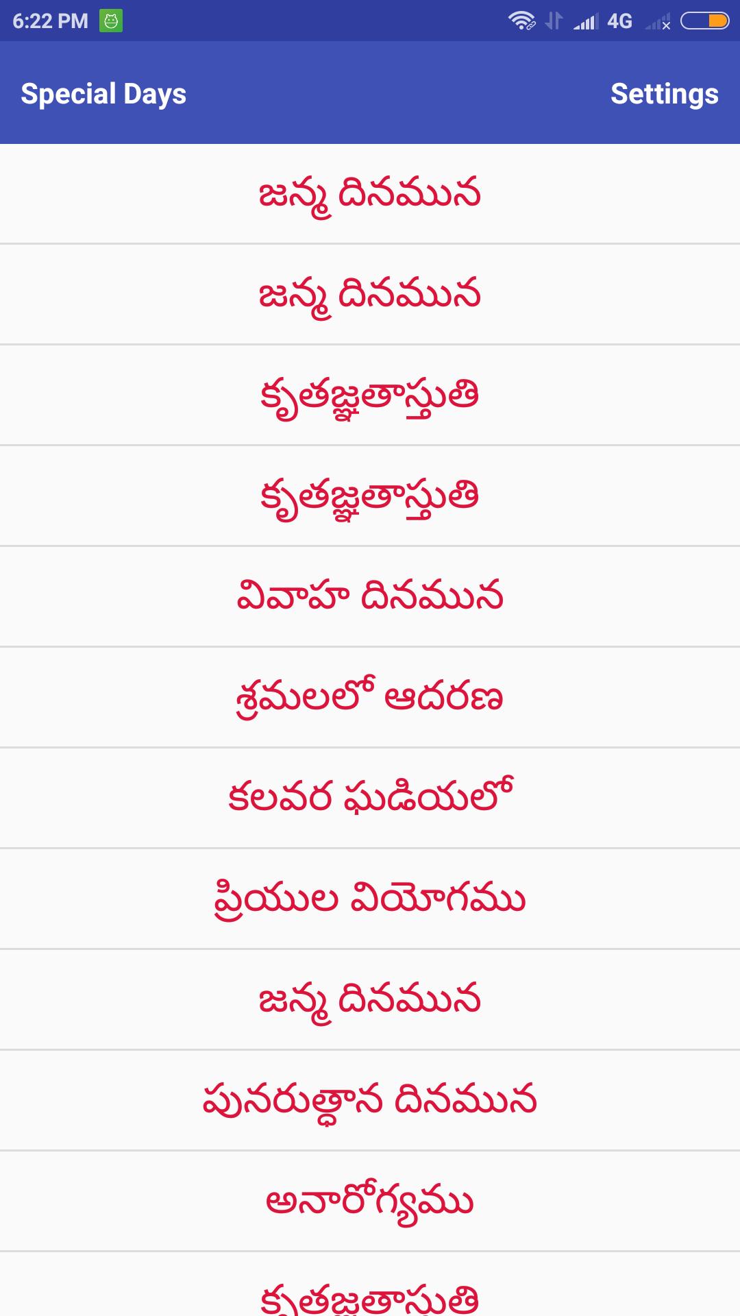 3. జన్మదినము వంటి ప్రత్యేక దినాల కొరకు వాక్యభాగము ధ్యానించడానికి సెట్టింగు ఓపెన్ చేసి Special days క్లిక్ చేస్తే కోరుకొన్న విశేష సమయము యొక్క దేవుని మాటలు చదువుకోవచ్చు.