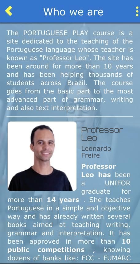 प्रोफ़ेसर लियो की युक्तियों के साथ स्पष्ट और निष्पक्ष रूप से पुर्तगाली जानें। आवेदन में, आप सिमुलेशन कर सकते हैं, टिप्स और ट्रिक्स देख सकते हैं, मंच में प्रश्न पूछ सकते हैं और बहुत कुछ। जो कोई भी लिखना, व्याकरण और पाठ व्याख्या सीखना चाहता है, उसके लिए पुर्तगाली प्ले कोर्स ऐप बहुत ही पूर्ण है।