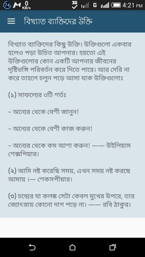 Bangla quotes app is a fantastic android app for read bangla quotes and share with friends by facebook status. Everyday you can share bangla quotation status. we added all motivational quotes bangla in this app. From this quotes bangla app you can learn thousand's of bangla famous quotes. We also add quotes bangla love for every lovers, lovers can read loves quotes and send love bangla quotes each other.You must need to read onupreronamulok ukti to follow bangla famous people footprint.