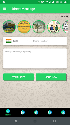 डायरेक्ट मैसेज व्हाट्सएप कहानियों को डाउनलोड करने की अवधारणा के आधार पर एप्लिकेशन है और मेरी संपर्क सूची में उस मोबाइल नंबर को सहेजे बिना व्हाट्सएप नंबरों को संदेश भेजना। एक डेवलपर के रूप में, हम व्हाट्सएप द्वारा प्रदान किए गए संदेश को भेजने के लिए एपीआई का उपयोग कर रहे हैं। और हमारे पास ग्रीटिंग संदेश की सूची भी है जहां से उपयोगकर्ता अपने प्रियजन को उस संदेश का चयन और भेज सकता है।