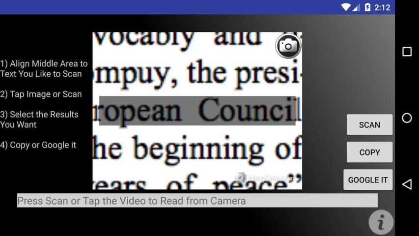 सरल -offline- ओसीआर आवेदन। यह स्कैन कर सकते हैं और अपने फोन या टैबलेट की पीठ के कैमरे का उपयोग कर दस्तावेजों में ग्रंथों को समझते हैं और क्लिपबोर्ड में कॉपी कर सकते हैं या गूगल पर खोज कर सकते हैं। पाठ मान्यता प्राप्त करने के बाद, आप परिणाम क्षेत्र और प्रेस "कॉपी" या "यह गूगल" से पाठ का चयन कर सकते हैं। केवल चयनित पाठ नकल की जाएगी या गूगल पर खोजा जाएगा।