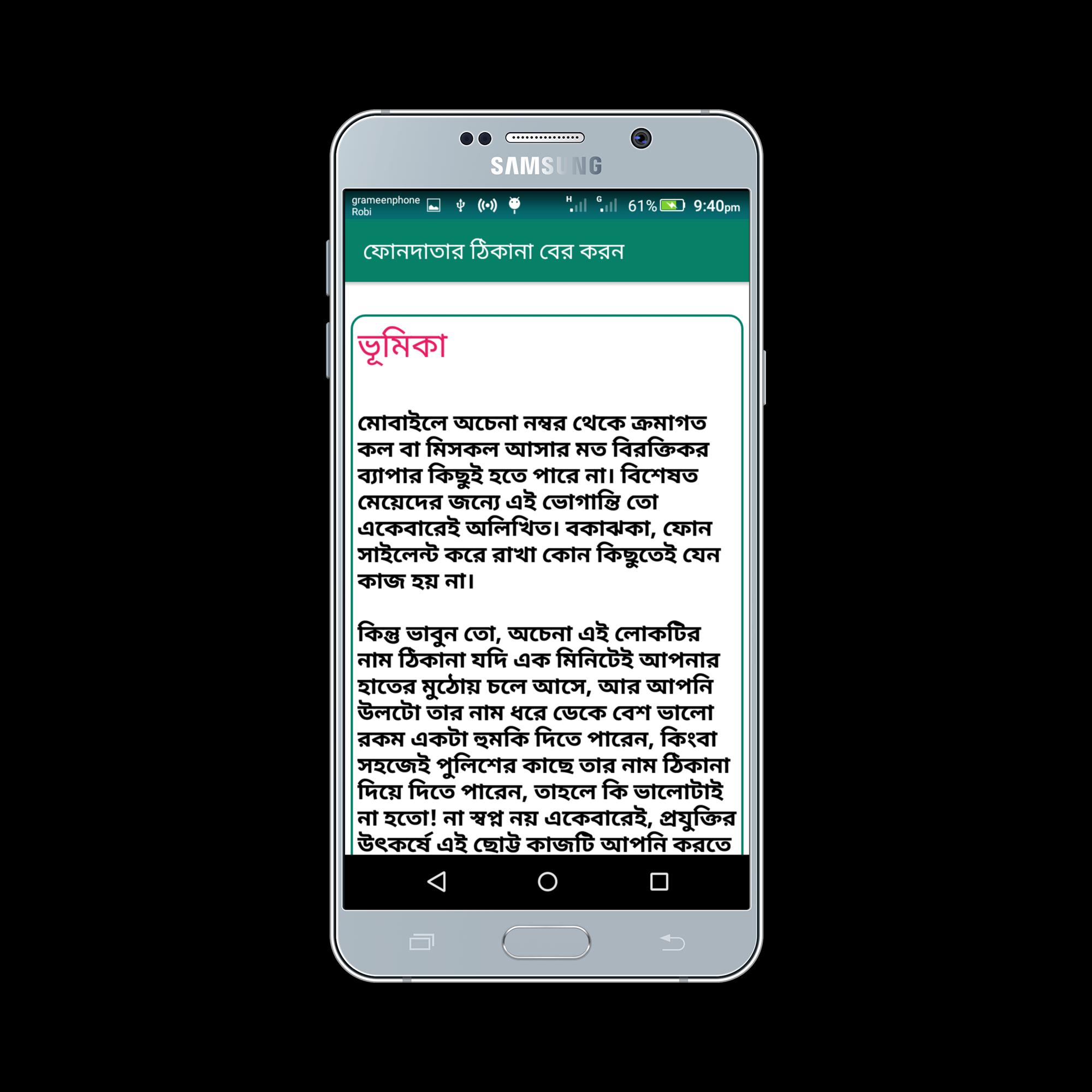 জন্য আমাদের আয়োজন ফোনদাতার ঠিকানা বের করন নামে একটি অ্যাপ । অ্যাপটির মাধ্যমে আপনি ফোনদাতার ঠিকানা বের করা/মোবাইল ফোন থেকে লোকেশন বের করা/ফোন থেকে অবস্থান বের করা/