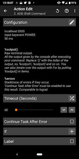 यह टास्कर प्लगइन आपको एक दूरस्थ डिवाइस (या डिवाइस स्वयं) में एडीबी शैल कमांड (या डिवाइस) में भेजने की अनुमति देता है जिसमें वाईफाई सक्षम है।