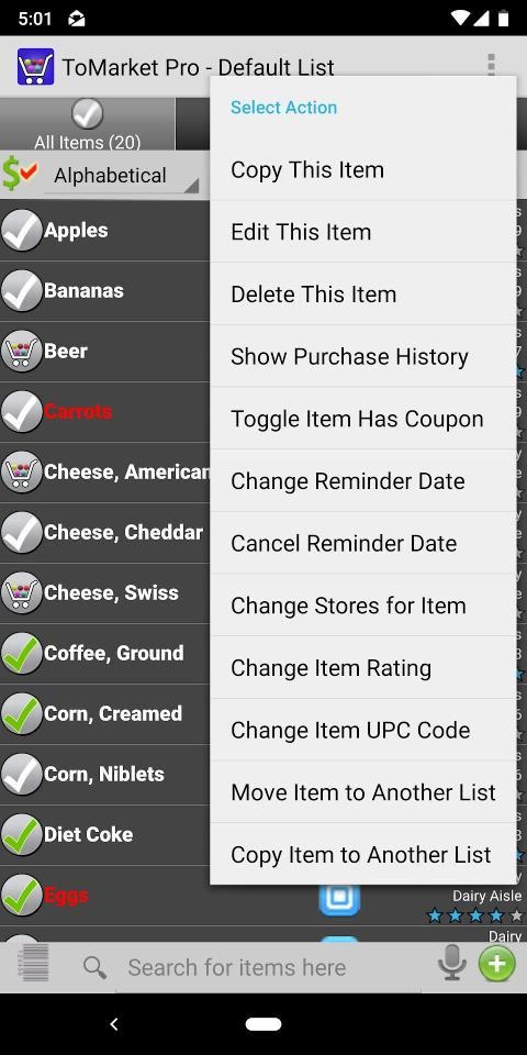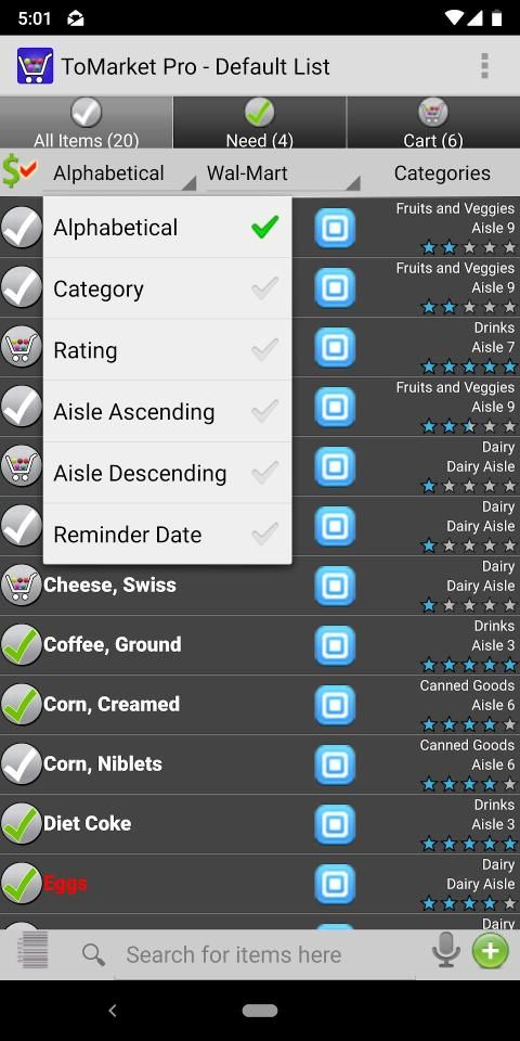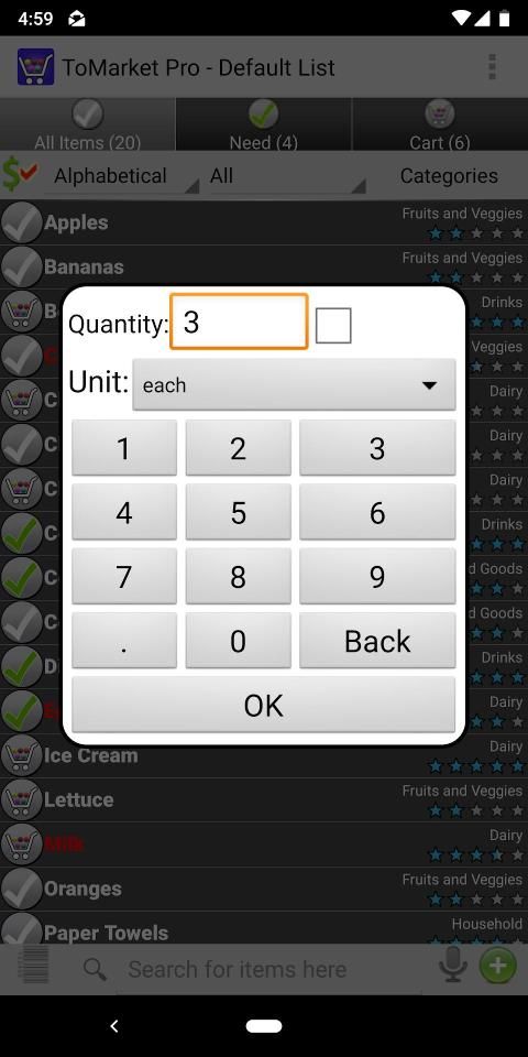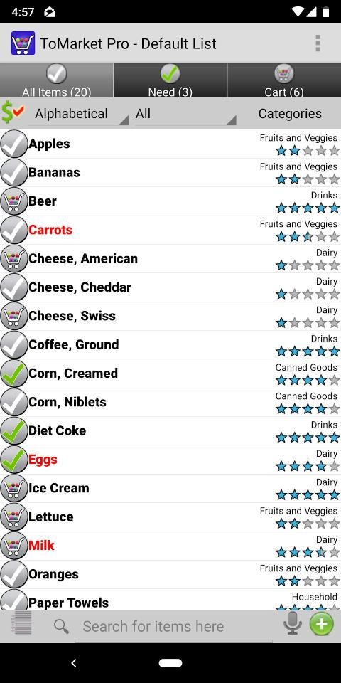 Voice Recognition – Search for items on your list and easily move it to need or cart. Add items by saying "NEED apples AND oranges AND bacon" or "ADD bacon"