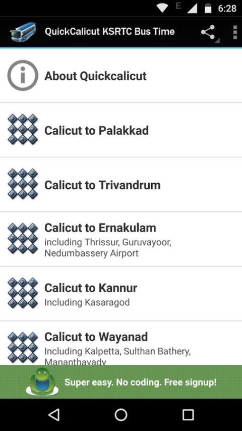 आवेदन उपयोगकर्ताओं को विभिन्न स्थलों के लिए कालीकट से केएसआरटीसी कम मंजिल एसी बस का समय खोजने में मदद मिलेगी।