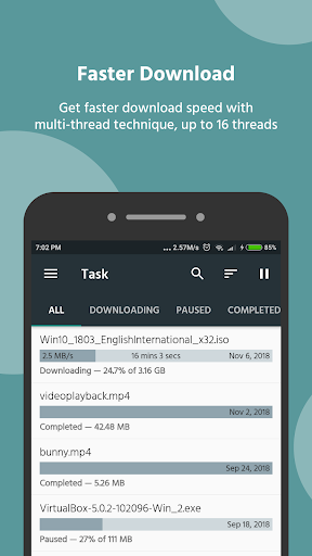 • When you connected to a network that limits your bandwidth for each clients and you have 2 devices or more, use the last feature by download the file partially in a time. For example, the first device downloads 0% - 50% of the file size, and the second device downloads 50% - 100% of the file size. Finally, join these two files with