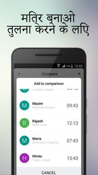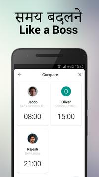 आप संपर्कों और शहरों से समय बदल सकते हैं ऐप स्वचालित रूप से आपके संपर्कों को पहचानता है और उनका समयक्षेत्र और वर्तमान समय (उनके प्रोफाइल में स्थान निर्धारित करने वाले लोगों के लिए) को समझता है। उसके बाद आप चुने गए संपर्क या शहर के साथ अपना समय बदल सकते हैं, साथ ही साथ अपना भूतपूर्व और भविष्य में समय का अंतर देख सकते हैं। कई समयक्षेत्रों में अंतर्राष्ट्रीय बैठकों का निर्धारण करने के लिए यह उपयोगी है