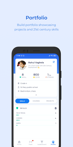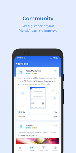 Besides quizzes and events, you can start building your global Camp K12 profile which keeps track of courses, projects, certificates and skills earned on the platform. You will also get free access to our global activity feed, where you will be featured on completing a quiz, publishing a project or enrolling/completing a Camp K12 course.