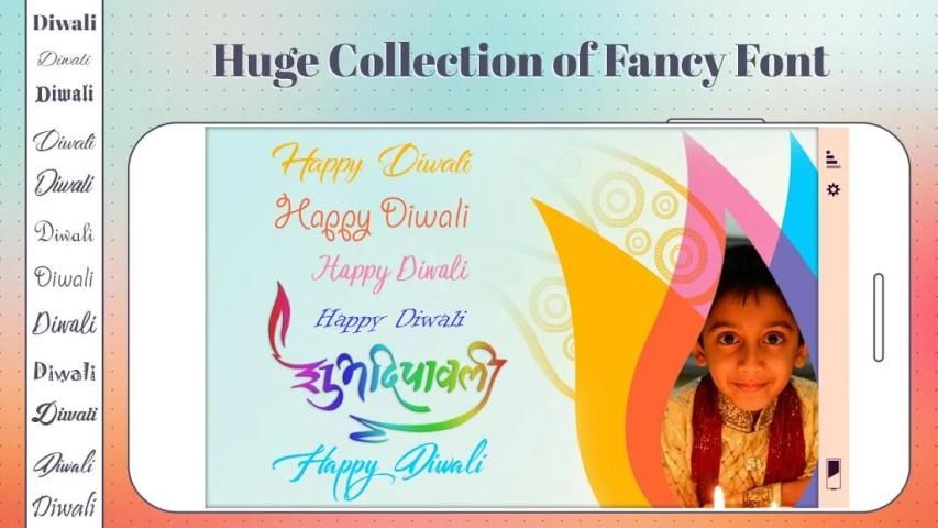 इस त्यौहार के दौरान, 5 लगातार दिनों के लिए लोग मनाए जाते हैं, जहां तीसरा दिन मुख्य दीपावली उत्सव के रूप में आनंद ले रहा है। यह आपको फोटो पर स्टाइलिस्ट टेक्स्ट आर्ट के साथ इस निमंत्रण कार्ड को बनाने की अनुमति देता है। शैली में मजेदार स्टिकर और टेक्स्ट एडिटर आपके कस्टम दिवाली ग्रीटिंग कार्ड बनाते हैं और अपनी खुशी को अपने दोस्तों, परिवार या रिश्तेदारों के साथ साझा करते हैं।