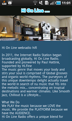 Hi On Line is an internet radio station for Hi-End Audio. All the music is playing in realtime, no loudness or equalisation. The sound is pure. Also in realtime, high speed, 2 track taperecorders will be used, 2 microphones recordings will be demonstrate on Revox A-77 tape recorder.