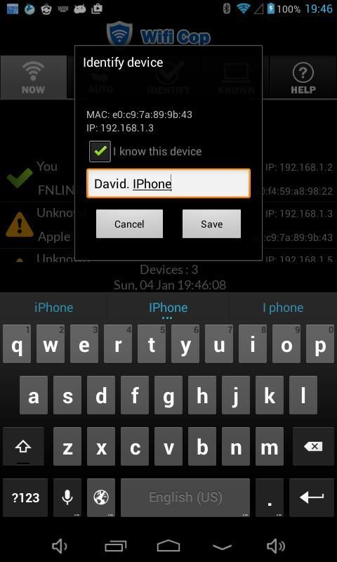 किसी भी नई डिवाइस अपने वाईफाई से कनेक्ट होता है, WifiCop अपने डेटाबेस में यह खोज करता है। अज्ञात हैं, तो यह अलार्म और आप आगे की कार्रवाई यह पहचान या एक घुसपैठिया है कि वहाँ संदिग्ध हो सकता है और क्या कर सकते हैं या तो।