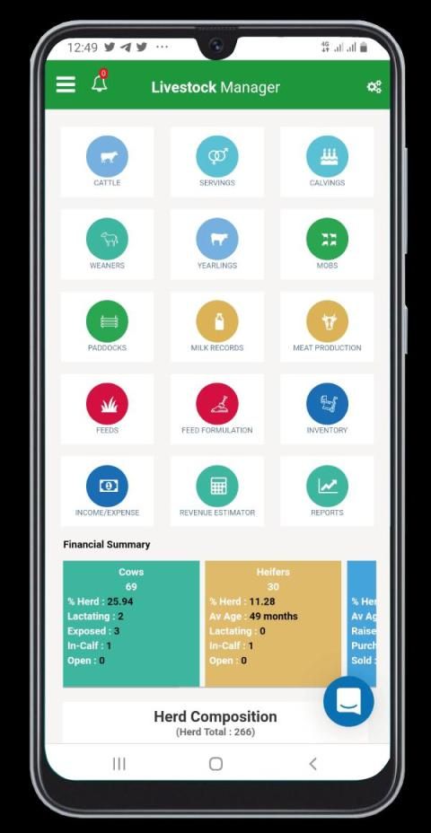 किसान खेत पर सभी जानवरों की संख्या, लागत और प्रदर्शन मेट्रिक्स, साथ ही जानवरों की बिक्री से वित्तीय ट्रैकिंग रख सकता है।