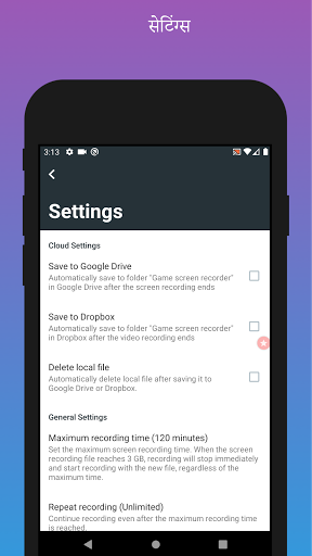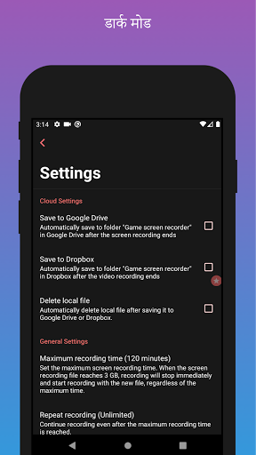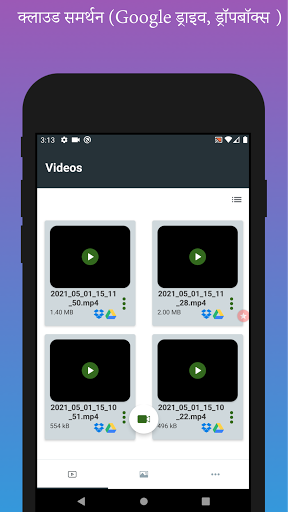 क्लाउड समर्थन (रिकॉर्ड किए गए वीडियो Google ड्राइव, ड्रॉपबॉक्स में स्वचालित रूप से अपलोड किए जाते हैं)