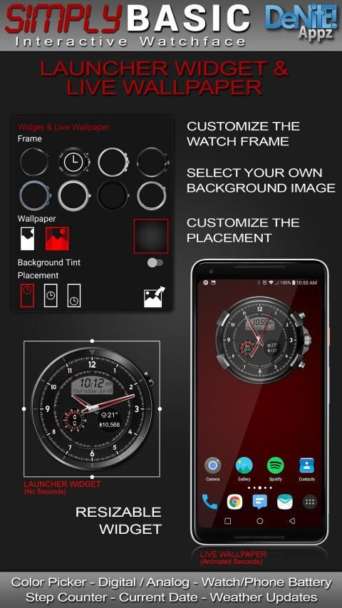 Watch Face, Clock Widget & Live Wallpaper brings a classic elegance to your wrist and Launcher. Features include custom complications, battery levels, weather conditions, step counter, color picker & date information. A settings app will also be installed on your mobile device to configure the watch face for any look you desire. Select any color and create a completely custom look for yourself! Don't have an Android Wear watch? No Problem! You can use the clock widget or Live Wallpaper on your launcher!