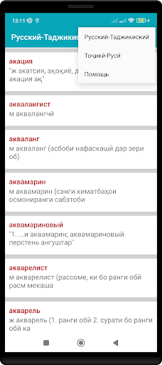 शब्दकोशों को रूसी से ताजिक और ताजिक से रूसी तक विकसित किया गया है।रूसी ताजिक शब्दकोश और ताजिक-रूसी शब्दकोश में 100,000 से अधिक शब्द हैं।एप्लिकेशन ऑफ़लाइन मोड में काम करता है।