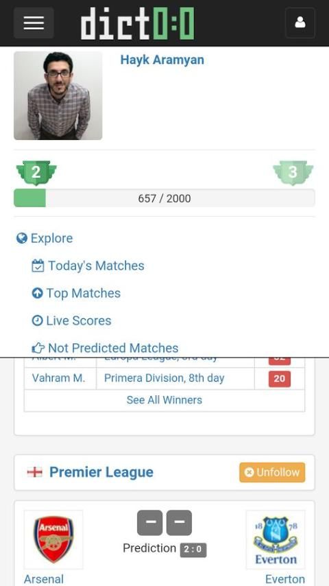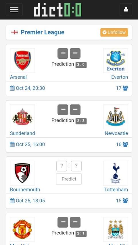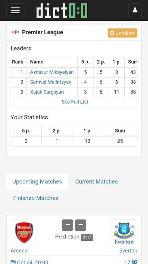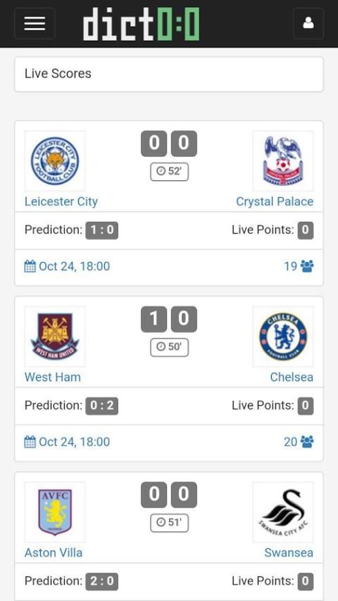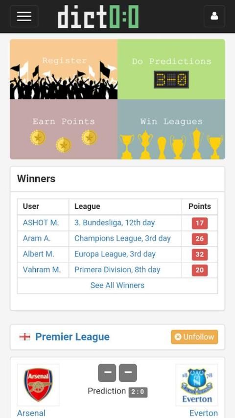You can get points depending on your prediction. For example you get 5 points for prediction of exact score. 2 points for goals difference and 1 point for prediction of winner. There are many leagues where you can participate and win. Also you can follow live scores, players stats and much more in Dictoro.