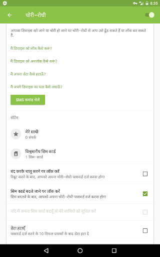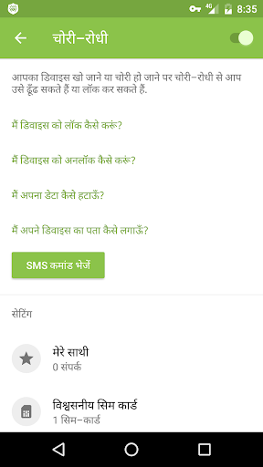 • संपर्कों की एक सूची बनाने की संभावना, जिस पर नए सिम कार्ड के नंबर से खोए हुए डिवाइस पर सिम कार्ड के परिवर्तन की सूचना प्राप्त करेंगे, जिसका उपयोग पुलिस से अपील करते समय किया जा सकता है। यदि आप पासवर्ड भूल जाते हैं, तो इन नंबरों का उपयोग फ़ोन को अनलॉक करने में किया जा सकता है।