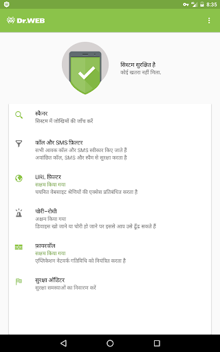 • रैनसमवेयर ट्रोज़न्स से डेटा को अनब्लॉक करना और सायबर अपराधियों को फिरौती के भुगतान बिना डेटा सुरक्षा। भले ही फ़ोन पूरी तरह ब्लॉक हो, भले ही ब्लॉकर्स की जानकारी Dr.Web वायरस डेटाबेसेस को न हो।