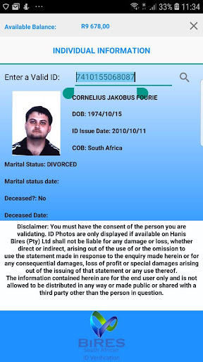 यह एक दक्षिण अफ्रीकी आईडी सत्यापन एंड्रॉइड एप्लिकेशन है जो एक विशिष्ट व्यक्ति के बारे में व्यक्ति की जानकारी प्रदान करता है। कृपया यह भी ध्यान दें कि यह एक भुगतान सेवा है और यह मुफ्त नहीं है, और केवल उन उपयोगकर्ताओं के लिए उपलब्ध है जो वॉल्यूम करते हैं, यह एक बार आईडी सत्यापन सेवा नहीं है।