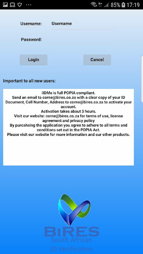 कृपया अपने पते और आईडी कॉपी के अपने प्रमाण की एक प्रमाणित प्रति भेजें corne@bires.co.za ताकि खाता सक्रिय किया जा सके। लॉगऑन क्रेडेंशियल्स जारी किए जाने से पहले सभी जानकारी सत्यापित की जाएगी।