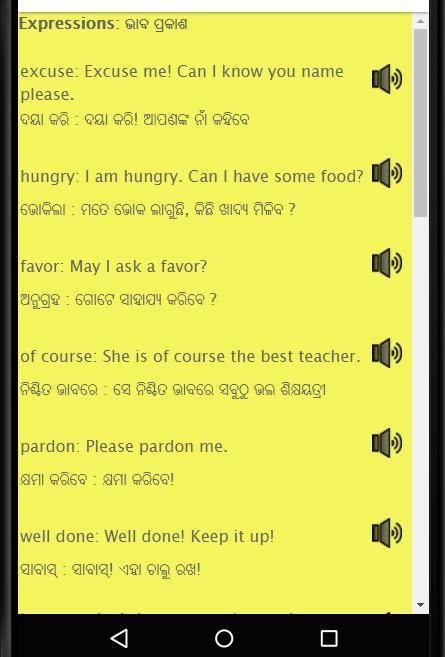 * Start learning these English lessons and improve your English knowledge with this application which is for beginners. This application provide skills in Basic English. You will start preparing yourself to learn Business English. Finding out common mistakes in English and common errors in English is important. You will be able to do so after going through this app, to a large extent. You will learn some English Vocabulary after completing which you will be able to go ahead and learn Synonyms and Antonyms. Using our apps, you can learn languages free. You can thereafter proceed with learning English Grammar and Parts of Speech. This app can also be used as a Odia to English phrasebook. What is for sure is that you will be able to learn English Vocabulary Daily. You will also be able to learn as to how to speak English Fluently in 30 days. First learn this and then go ahead and then you can also use an English Idioms and Phrase Dictionary. This app can also be useful for those who want to learn English for Competitive Exams. You can also hereafter jump-start with a Group Discussion app or an Interview Questions and Answers app. Learn how to speak English fluently in 30 days. Many can also use this app as a Learn English Magazine app. This app can be used to improve English for BPO Interview. You will also be able to Learn English words daily. You will slowly become more familiar with English verbs. A warm welcome is also extended to those who want to learn English for Bank Exams - English for Banking. Some can use this for SSC preparation. To put it in simple words, play and learn English using this app. You will become better with Oriya to English speaking if you also use a Odia to English dictionary or English to Oriya dictionary apart from this application.