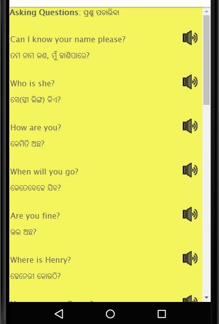 This revised version of Oriya to English Speaking Application is intended to improve the quality of this app. Learning English using Odia will become simple and unique. This new version will be free as well as with offline feature. This application provides the required features and teaches English in a step by step manner. We have invested the efforts to enrich the user experience with this new version of English Speaking application that teaches English from Oriya language.