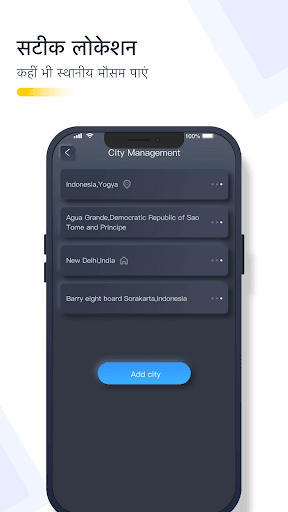 -शहर की सूची आपको विभिन्न शहर के रिकॉर्ड प्रदान करे। जब भी आप दूसरे शहरों की मौसम की दशा जानना चाहें, तो आप शहर आसानी से बदल पाएं।