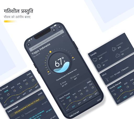 एक बार हमारे ऐप में प्रवेश करते ही मौजूदा मौसम की दशा स्क्रीन पर गतिशील रूप से दिखाई जाएगी। तापमान स्थिति भव्यता से एनिमेट की गई है ताकि आपको अपने अनुभव जैसा लगे। जब तापमान बदल रहा हो, तो रंग भी उसके अनुसार बदलेगा।