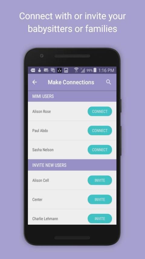 आसानी मिमी में शामिल होने के लिए अपने बेबीसिटर्स को आमंत्रित करें या अपने sitters पहले से ही मिमी का उपयोग कर के साथ कनेक्ट