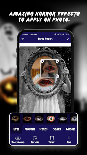 horror Photo Editor enables us to have different pics of horror in the photo by adding some effect of ghost, sound and funny image, scary image.