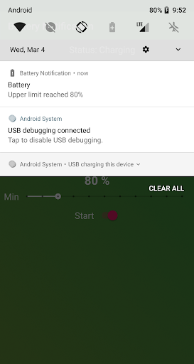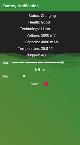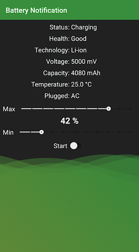 प्रारंभ बटन पर क्लिक करें और ऐप एक अलार्म भेजता है बैटरी प्रतिशत आपके वांछित मूल्यों तक पहुंच गया।