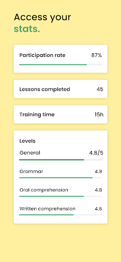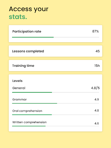 प्रेरणा।सामग्री की विविधता के साथ, जिमग्लिश अपने उपयोगकर्ताओं को ई-लर्निंग को यथासंभव मज़ेदार बनाकर अपनी प्रगति को जारी रखने के लिए प्रेरित करता है।