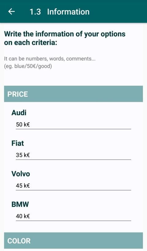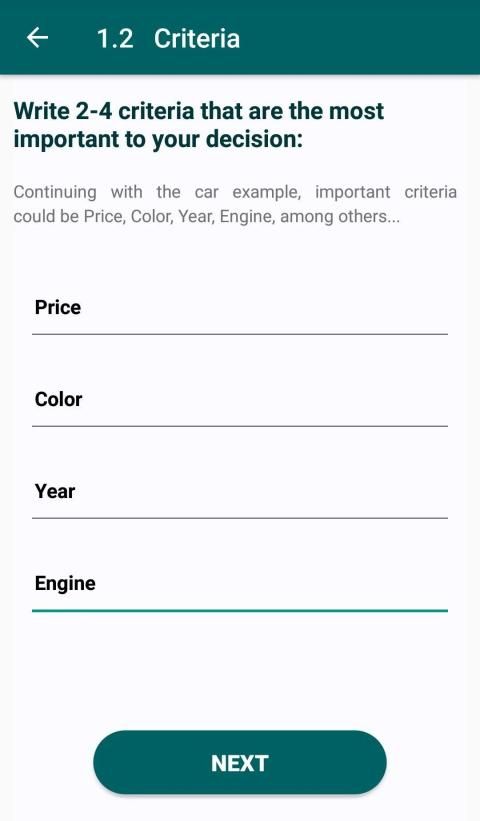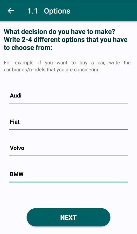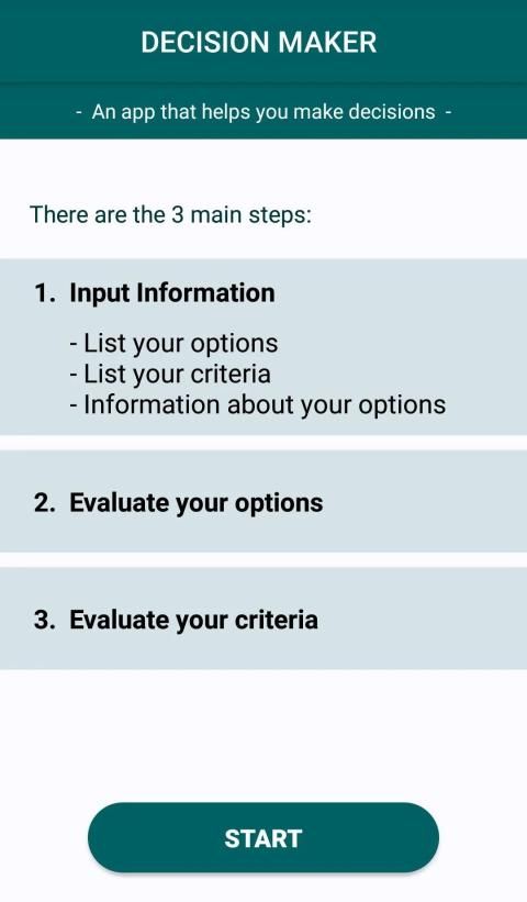 यह सरल लेकिन स्मार्ट ऐप आपकी जानकारी और वरीयताओं के लिए पूछता है और सटीक निर्णय लेने वाले टूल का उपयोग करके स्कोर में अनुवाद करता है, जो आपको अपने विकल्पों की तुलना करने और सर्वोत्तम निर्णय लेने में मदद करेगा!