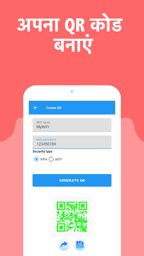 लेकिन वह सब नहीं है। हमारा ऐप एक स्कैनर के रूप में भी दोगुना हो जाता है: आपको अपने आस-पास के वाईफाई नेटवर्क के लिए क्यूआर कोड स्कैन करने और बिना किसी परेशानी के नए वाईफाई नेटवर्क से कनेक्ट करने की अनुमति देता है। साथ ही, हमारा पासवर्ड-मुक्त क्यूआर कोड जनरेटर आपको अपने वाईफाई को मेहमानों या आगंतुकों के साथ साझा करने में सक्षम बनाता है।