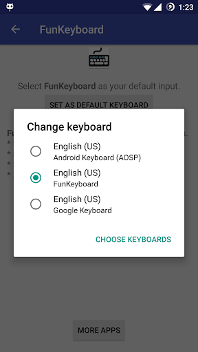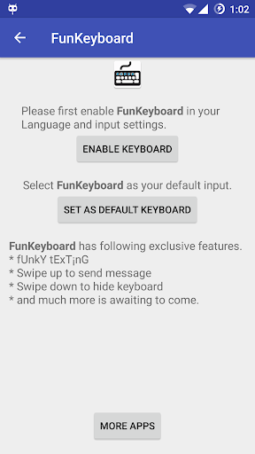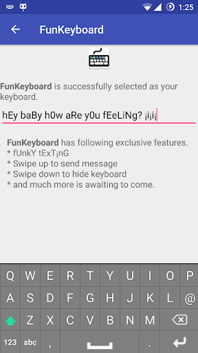 FunKeyboard has following exclusive features. * fUnkY tExT¡nG * Swipe up to send message * Swipe down to hide keyboard * and much more is awaiting to come.