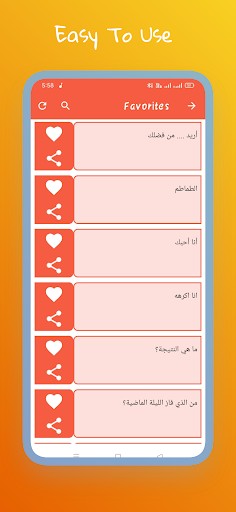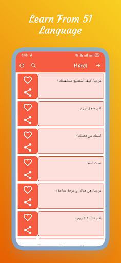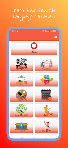 लर्न अरबी वाक्यांश ऐप की एक अतिरिक्त लेकिन उपयोगी विशेषता पसंदीदा सूची अनुभाग है।एक लाल दिल एक पसंदीदा भाग को इंगित करता है।यदि कोई व्यक्ति किसी शब्द का बहुत उपयोग करता है, या एक शब्द को बहुत बार याद नहीं कर सकता है, तो यह सूची उनके लिए बहुत उपयोगी हो सकती है।जब भी कोई एक महत्वपूर्ण शब्द के साथ आता है, तो बस उसके बगल में खाली दिल पर टैप करें और उस शब्द को सूची में जोड़ें।