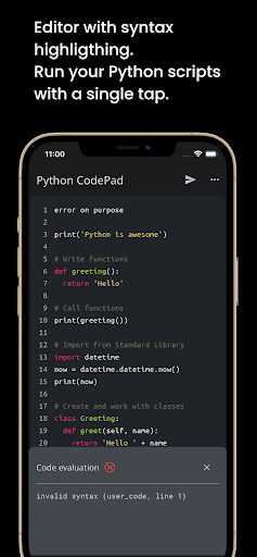 पायथन कोड चलाएं और अपने मोबाइल डिवाइस पर पायथन सीखें।