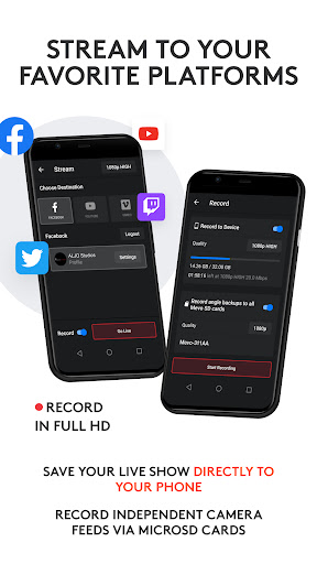 आसानी से अपने दर्शकों के साथ कई कैमरा कोणों को साझा करेंपूर्ण HD में फोन।प्रत्येक व्यक्तिगत कैमरा फ़ीड को सीधे अपने स्थानीय माइक्रोएसडी कार्ड में रिकॉर्ड करें।