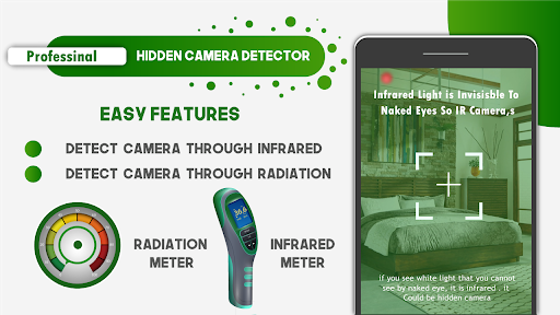 फ्री हिडन आईआर कैमरा डिटेक्टर और हिडन डिवाइस फाइंडर ऐप आसानी से छिपे हुए कैमरे और माइक्रोफोन का पता लगाएगा।यह ऐप विशेष रूप से उन उपयोगकर्ताओं के लिए डिज़ाइन किया गया है जो अपनी गोपनीयता को सुरक्षित करना चाहते हैं।बस एक एंड्रॉइड फोन का उपयोग करके छिपे हुए कैमरे और माइक्रोफोन का पता लगाने के लिए टैप करें।फास्ट हिडन कैमरा डिटेक्टर गोपनीयता का समाधान है।यह ऐप स्वतंत्र रूप से उपलब्ध है और सबसे अच्छा छिपा हुआ कैमरा डिटेक्शन ऐप माना जाता है।