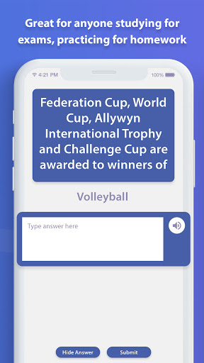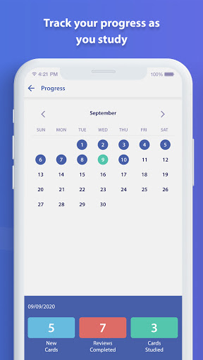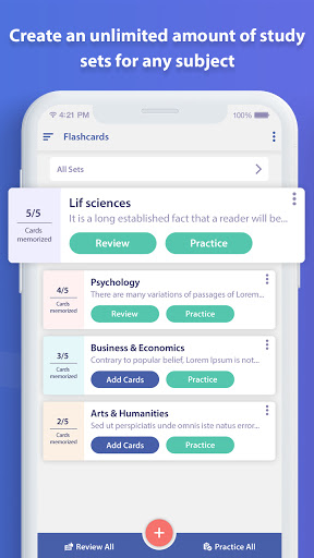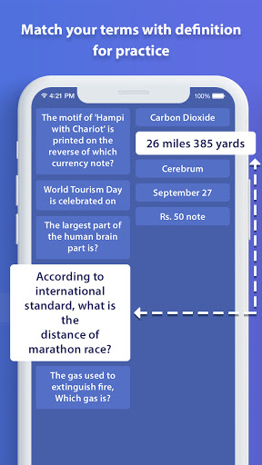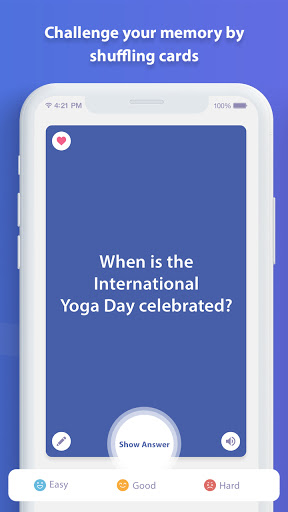 यह ऐप परीक्षा के लिए आपके अध्ययन को याद करने या किसी भी प्रकार की सामग्री को याद करने का सबसे अच्छा तरीका प्रदान करता है।APP अपनी अध्ययन सामग्री को संशोधित करने के लिए अलग -अलग अभ्यास विधियां प्रदान करता है जैसे कि बेसिक रिव्यू, सेलेक्ट डेफिनिशन, मैच कार्ड, राइटिंग रिव्यू और ऑडियो रिव्यू।