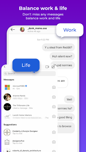 • Run two accounts simultaneously and switch between them fast with one-tap to effective manage different accounts.